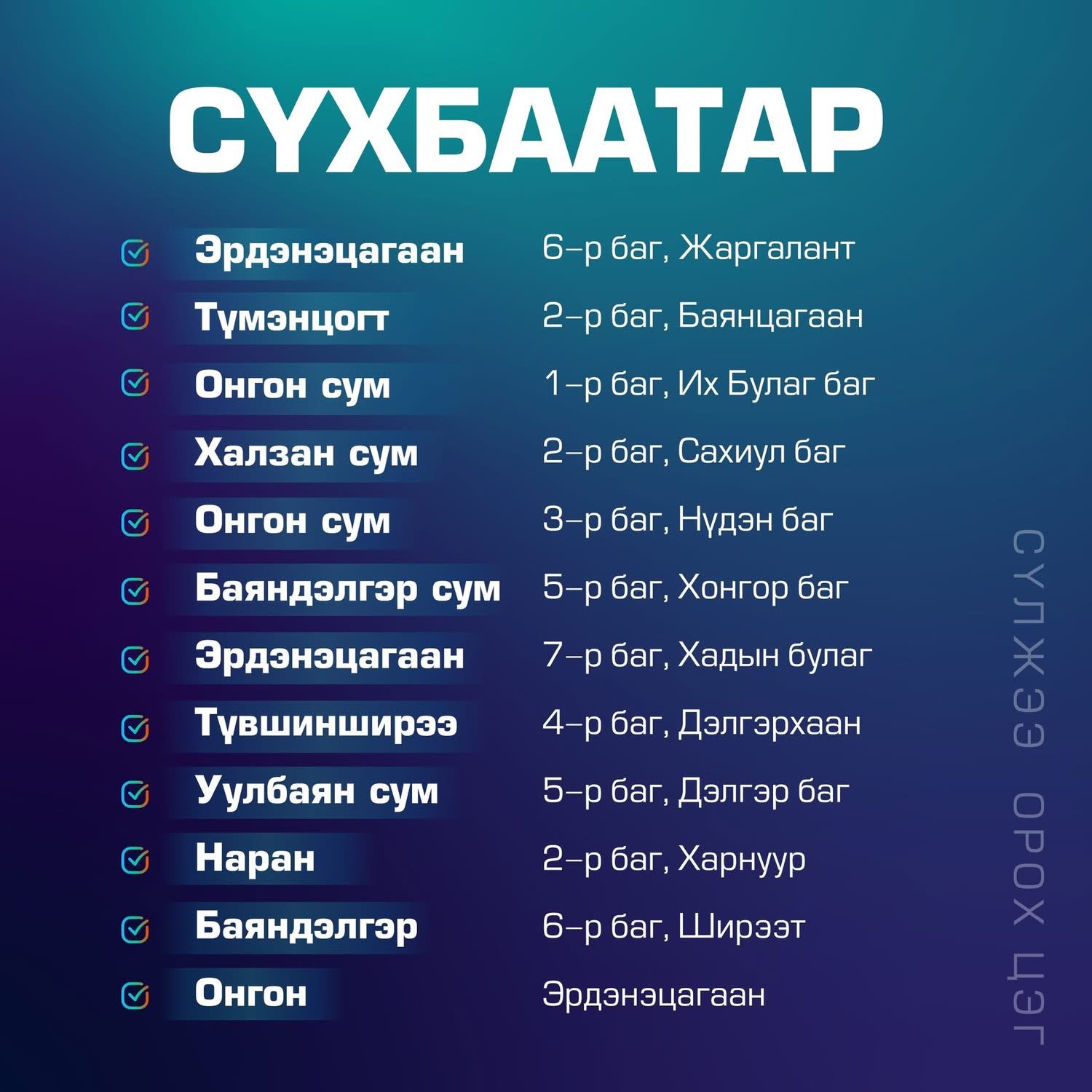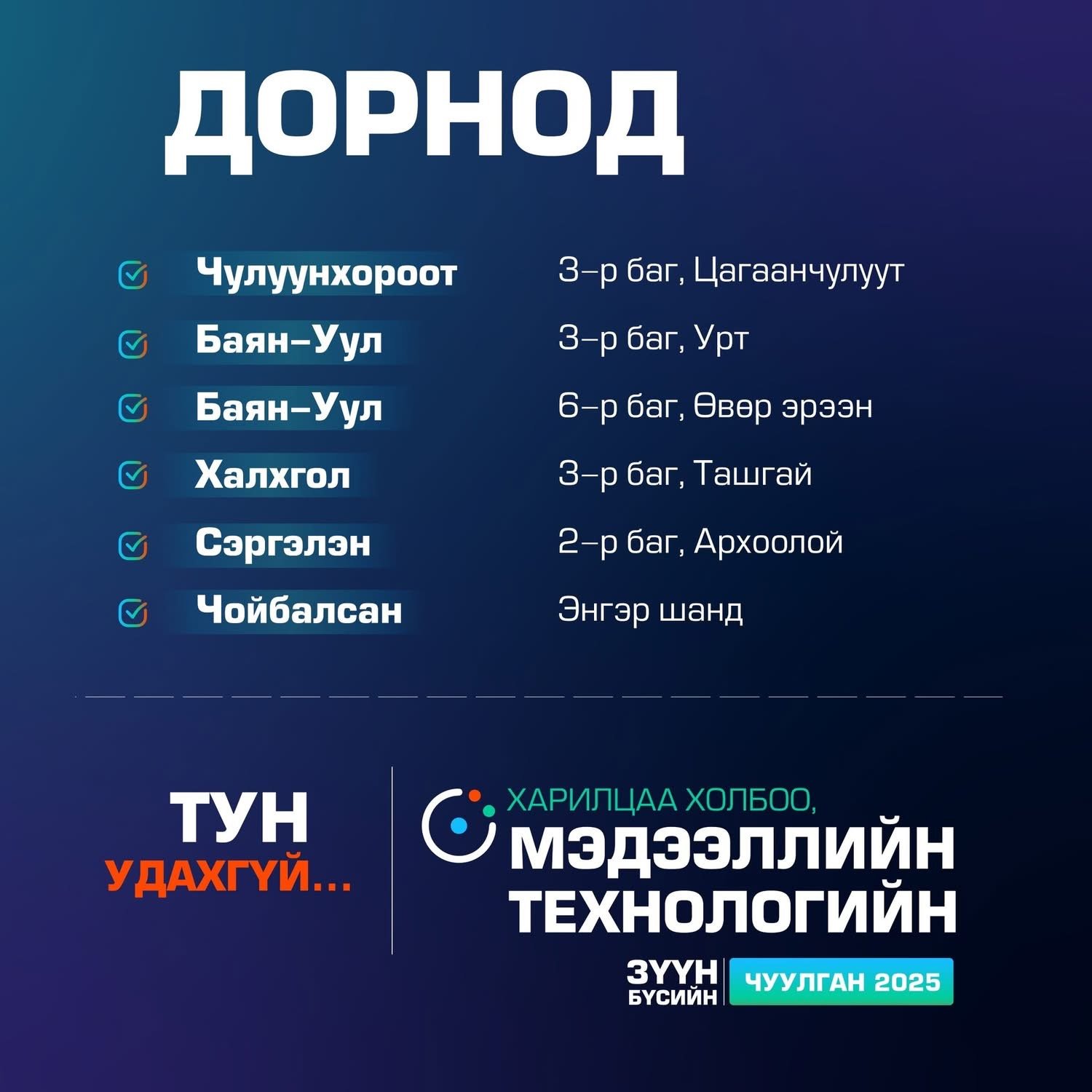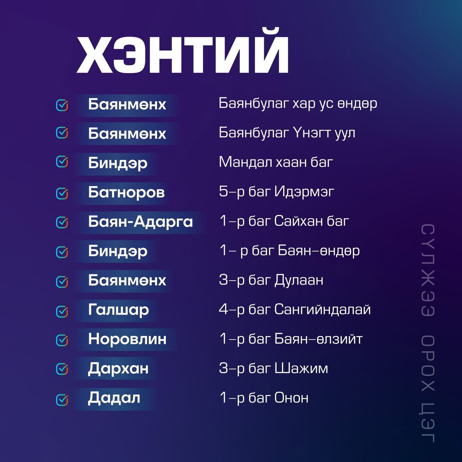 Хэнтий аймгийн хувьд Баянмөнх сумын Баянбулаг багийн Хар ус өндөр, Үнэгт уул, Дулаан баг, Биндэр сумын Мандалхаан баг, Батноров сумын Идэрмэг 5 дугаар баг, Баян-Адарга сумын Сайхан 1 дүгээр баг, Галшар сумын Сангийн далай баг, Норовлин сумын Баян-Өлзийт 1 дүгээр баг, Дархан сумын Шажин баг, Дадал сумын Онон 1 дүгээр багуудад сүлжээ тавигдах юм.